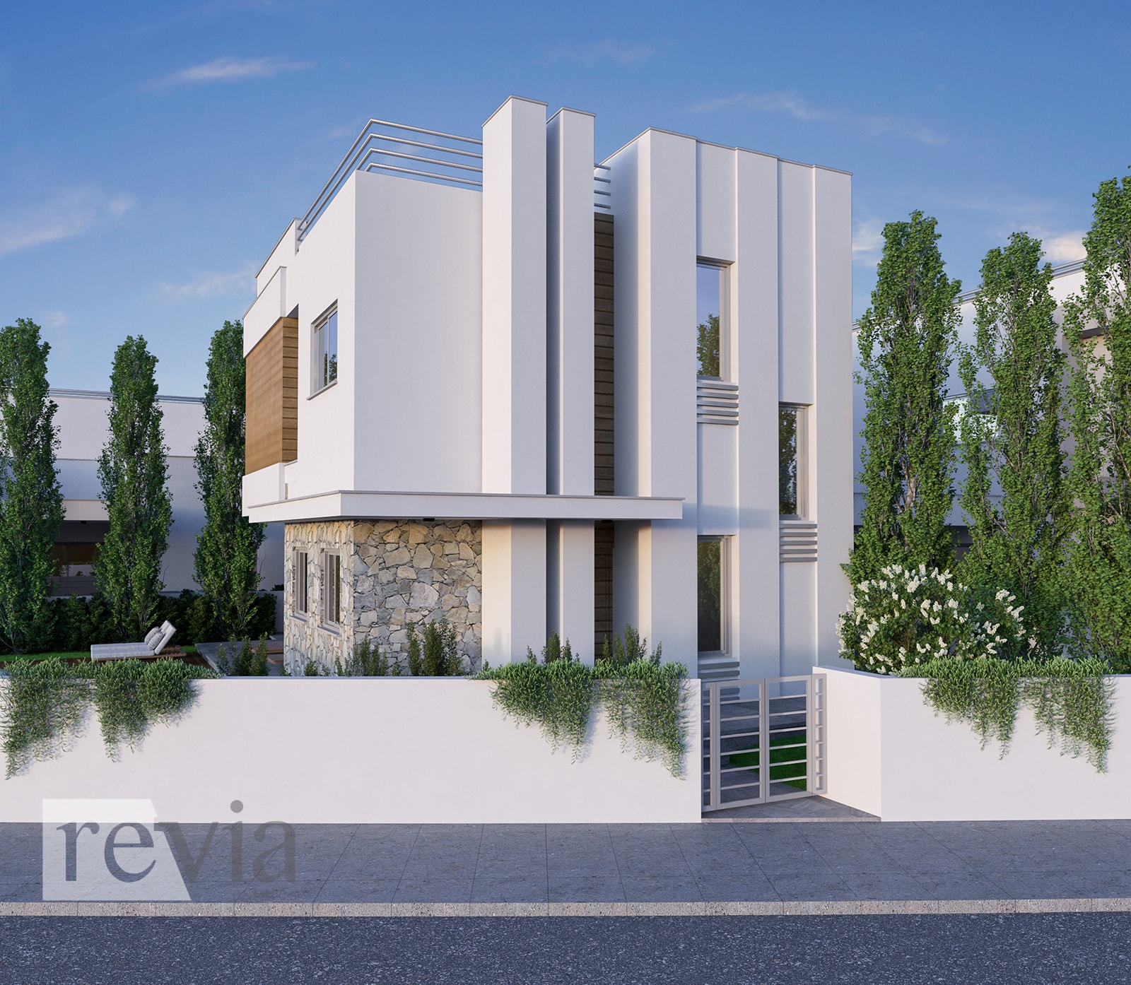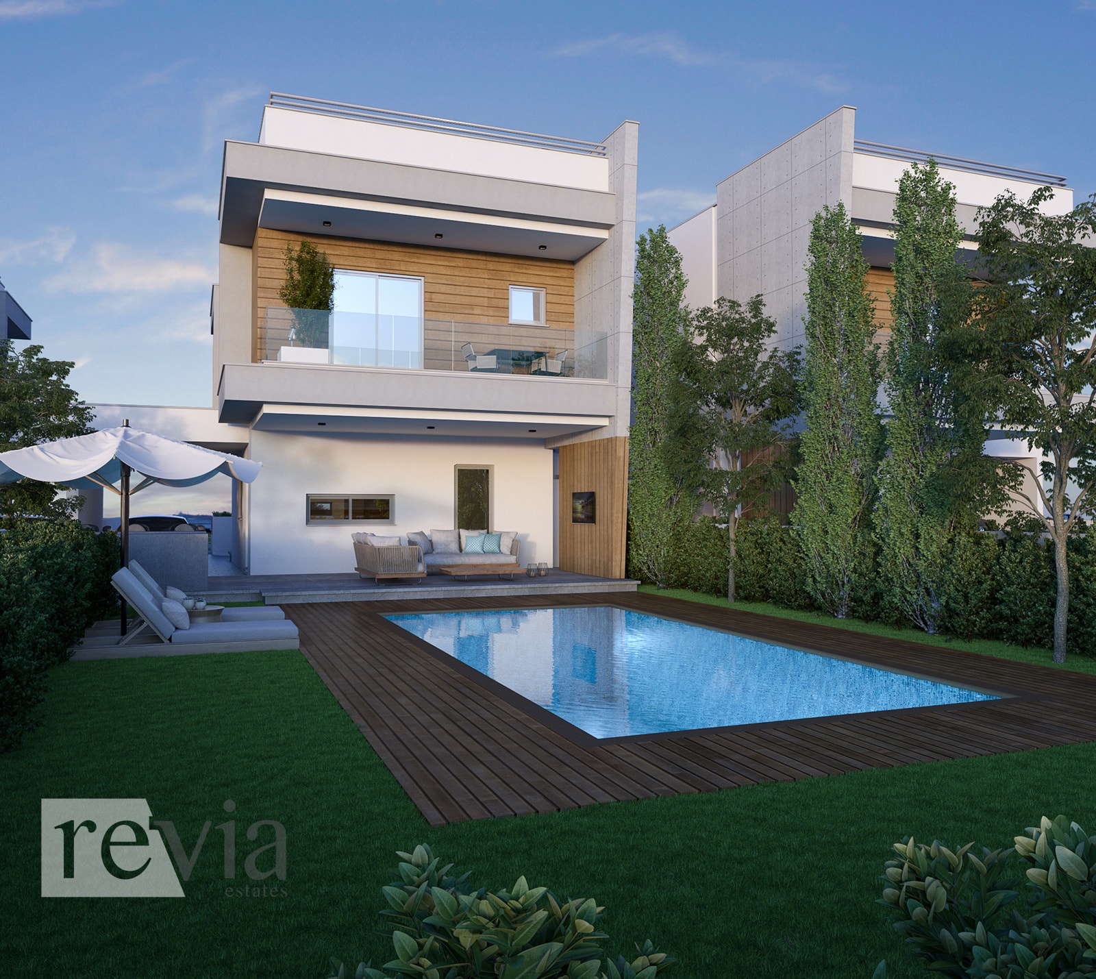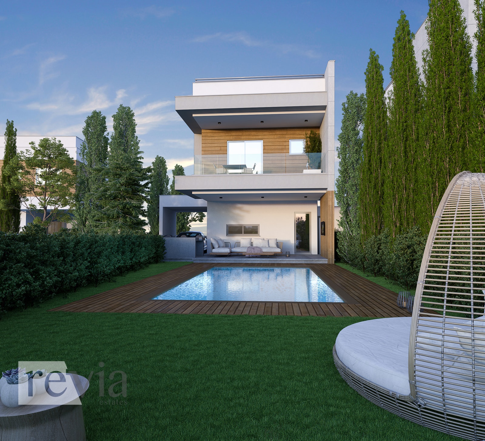 Villa For sale in Parekklisia. The Villa is 186 sq.m. and it is located on a plot of 404 sq.m.. It consists of: 3 bedrooms (1 Master), 2 bathrooms, 1 wc and it also has 1 parkings (1 Closed), the energy certificate is: A, Swimming pool, Garden. Price: €450.000. Revia Estates, contact phone: 70008280, email: info@reviaestates.com, website: https://www.reviaestates.com