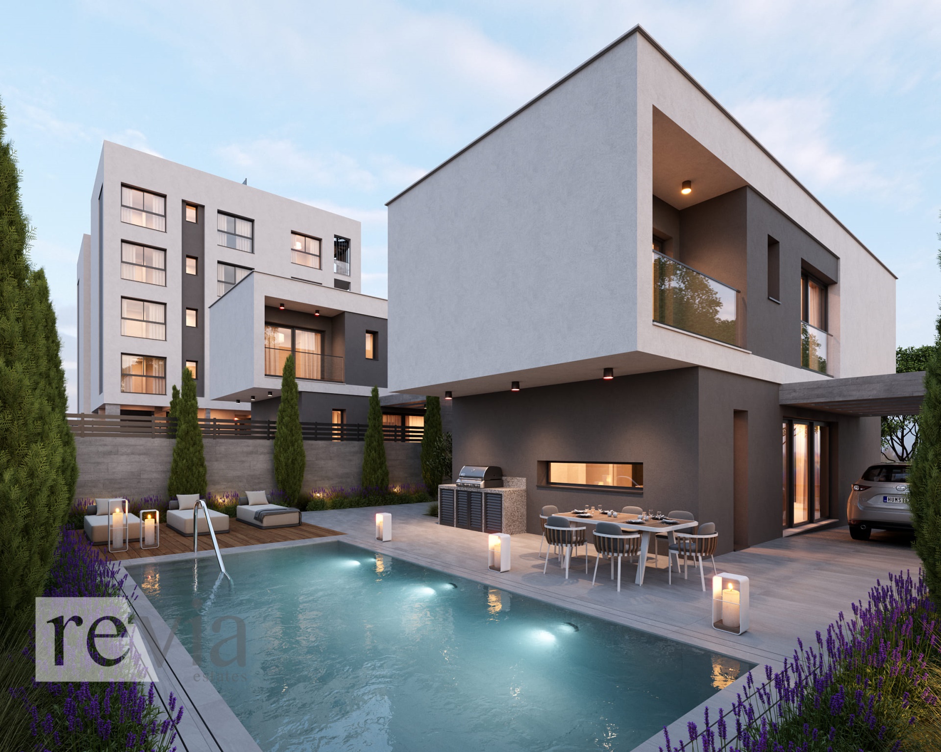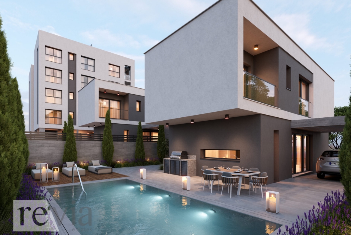 Semi-detached For sale in Agios Athanasios – Agios Athanasios. The Semi-detached is 191 sq.m. and it is located on a plot of 382 sq.m.. It consists of: 3 bedrooms (1 Master), 2 bathrooms, 1 wc, 1 kitchens, 1 living rooms and it also has 2 parkings (1 Pilotis space, 1 Open), Solar water system are also available, it has Alluminum frames with Double glazed windows, the energy certificate is: A and its floors are Laminate. The property’s status is: Under construction, it is close to Transportation, Park, School, Church, Super Market, it has Openness view, Luxury and it also has the following unique features and advantages: Elevator, Electric Appliances, Storage, Internal staircase, Swimming pool, Garden, CCTV, Solar panels. Price: €860.000. Revia Estates, contact phone: 70008280, email: info@reviaestates.com, website: https://www.reviaestates.com