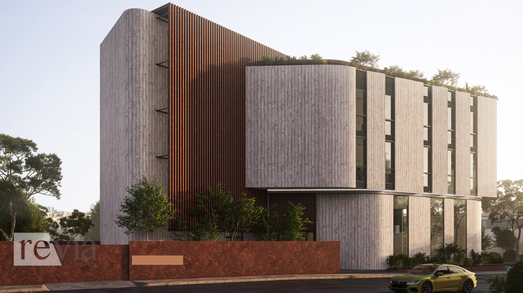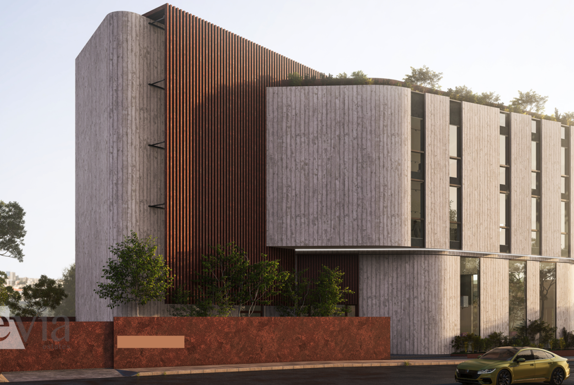Anchored by a striking concrete façade, the building boasts vertical window openings that invite natural light deep into the interiors. At its core lies a stunning atrium, crowned with a skylight that bathes an internal garden in radiant sunlight, creating a tranquil centerpiece for office spaces.