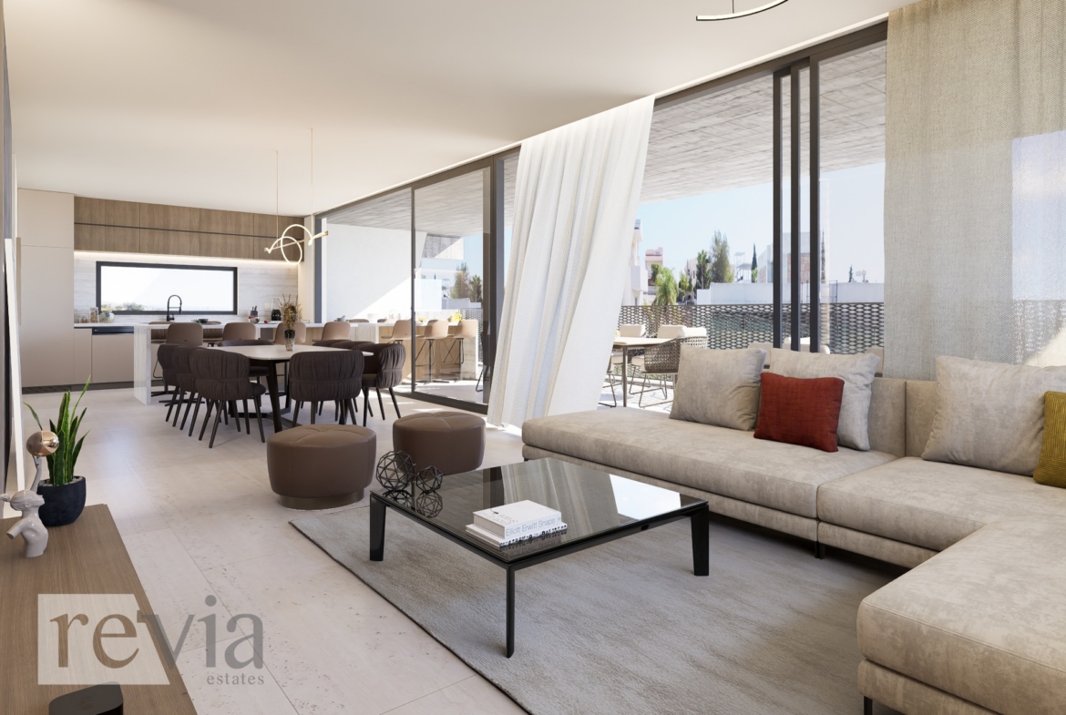 This luxurious penthouse in Agia Fyla, Limassol, offers 159 sq.m. of contemporary living space, along with an impressive 110 sq.m. private roof garden.